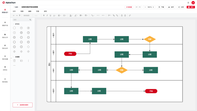 在AlphaChart中每個符號都是矢量的,可以填充顏色,改變大小,定義數據和連接。在流程圖標準符號包括4個基本流程符號橢圓形、矩形、箭頭、菱形和5類中高級的流程圖符號。通用流程圖